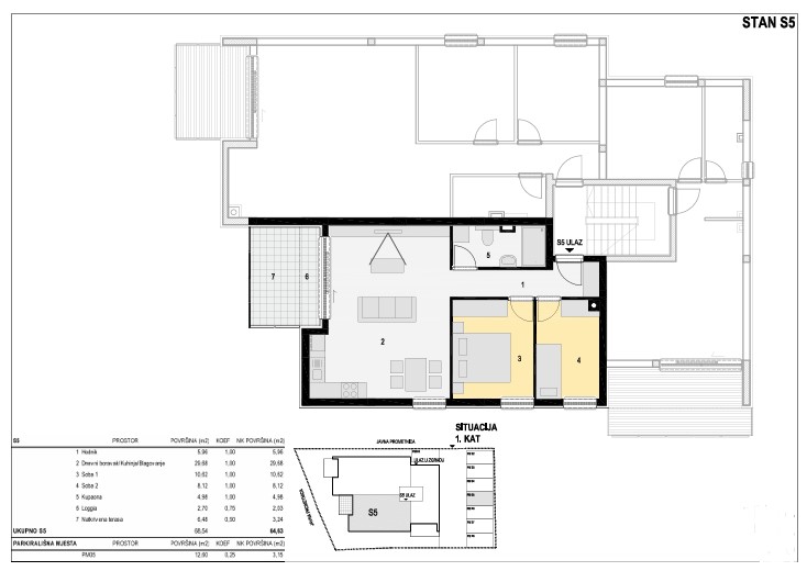 Stan S5 – površine 64,63 m2 na prvom katu, sastoji se od: dvije spavaće sobe, dnevnog boravka povezanog s kuhinjom i blagovaonicom, hodnika, kupaonice i natkrivene  terase. Cijena 393.597 €