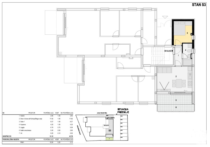 Stan S3 – površine 41,76 m2 u prizemlju sastoji se od: ulaznog hodnika, spavaće sobe, moderno uređene kupaonice, dnevnog boravka povezanog s kuhinjom i blagovaonicom, natkrivene terase. Dodatno, stan ima vlastiti vrt bruto površine 9,25 m2, savršen za boravke na otvorenom, uživanje u ljetnim večerima. Cijena 246,386 €